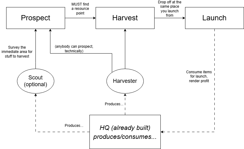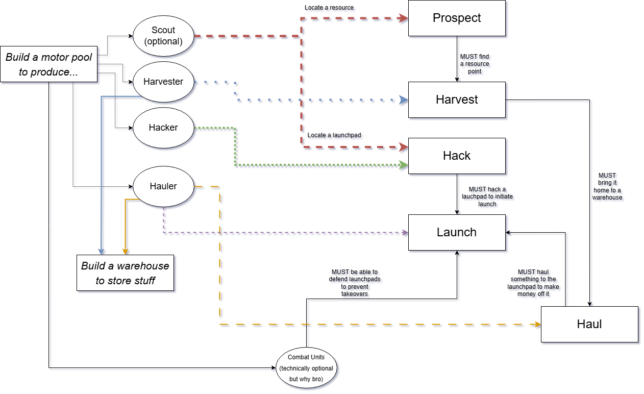 For starters, players need to know about their prerequisites. They cannot proceed without at least a Motor Pool and Warehouse. They must at least have a Harvester, Hacker, and Hauler. They must find a resource point, and find a launchpad to launch from. They must hack that launchpad to acquire control of it. They then have to harvest, store, load, unload, and launch, in that order.